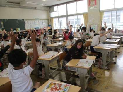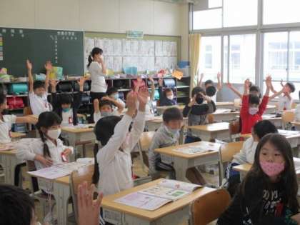 2年生の音楽の授業で「ドレミファ体操」に挑戦していました。「え〜むずかしい!」などと言いながら、楽しそうに音階のポーズをとっていました。