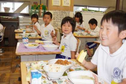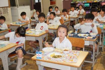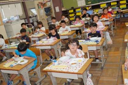 今日の献立は生揚げのみそ炒め、おかかあえ、厚焼き玉子、乾燥小魚でした。1,2年生のみなさん、おいしく食べられましたね。
