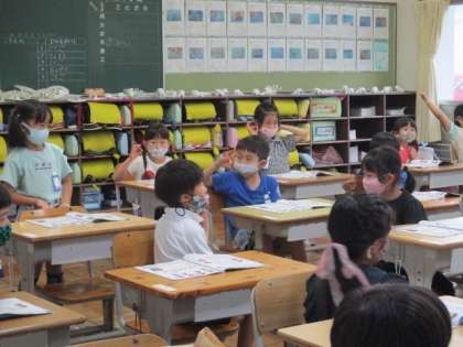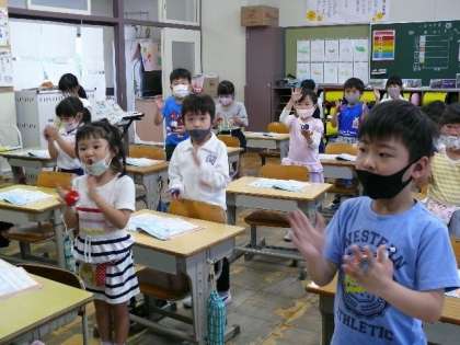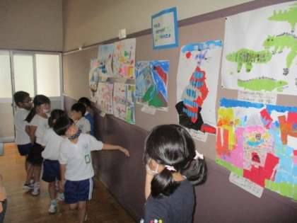 1枚目は2組のリズム打ちの授業で意見を発表している様子です。2枚目は4組の図工で友達の絵を鑑賞している様子です。3枚目は5組の音楽でカスタネットを演奏している様子です。