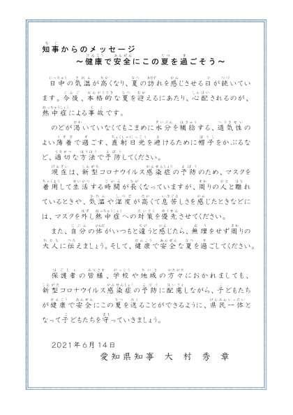 熱中症防止のための愛知県知事からのメッセージです。 →拡大