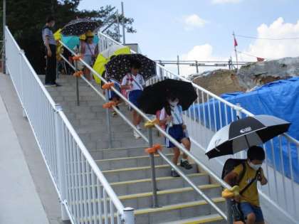 通学路変更(1) 7月13日(火) 公開日 2021/07/13 更新日 2021/07/13 お知らせ 本日の下校から正門からの登下校ができなくなり、運動場南に設置された階段から登下校することになりました。階段中央に手すりを増設、階段のふちに滑り止め設置など、安全性を高める配慮をしてもらっています。下校時は教師が階段状で交通整理をして、安全に降りられるよう指導しました。