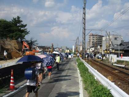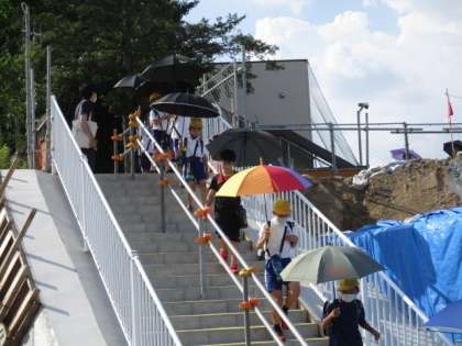 通学路変更(3) 7月13日(火) 公開日 2021/07/13 更新日 2021/07/13 お知らせ 3〜6年生の下校の様子です。初めて降りる新しい階段にみんなわくわくしている様子でした。明日の登校もこの階段から校内へ入ります。教員が階段付近で安全に登れるよう指導します。