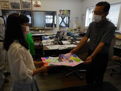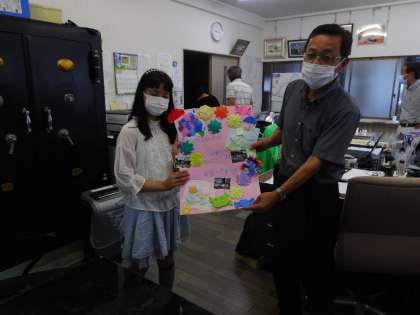 緊急事態宣言発令のため実施できなかった「感謝の会」。地域のみなさんに感謝の気持ちを伝えるために、子どもたちが作ったおり紙を使ったメッセージボードを代表児童が贈呈しました。写真は吉原町自治区区長さんへの贈呈の様子です。