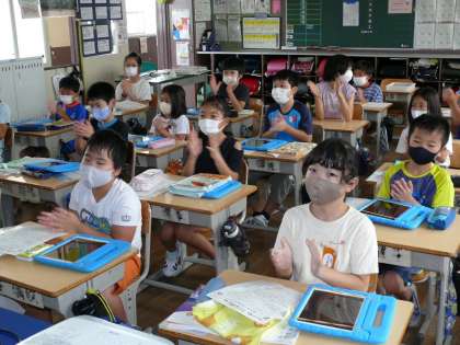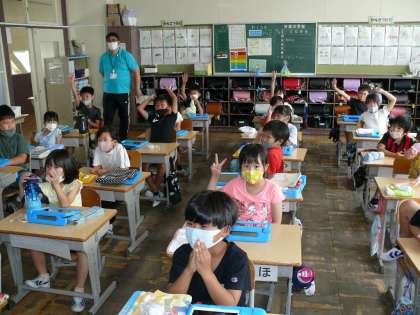 夏休み明け集会の学級の様子です。みんな静かにお話を聞いていました。
