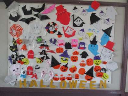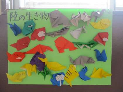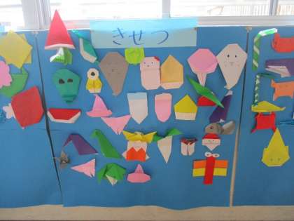 各教室や掲示板におりがみ作品があふれています。
