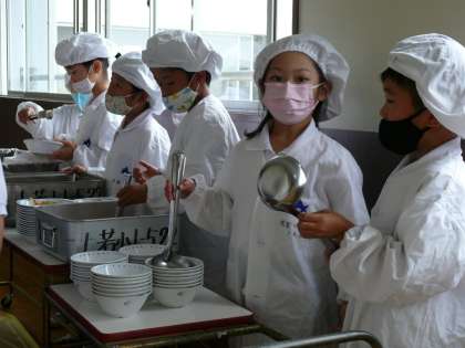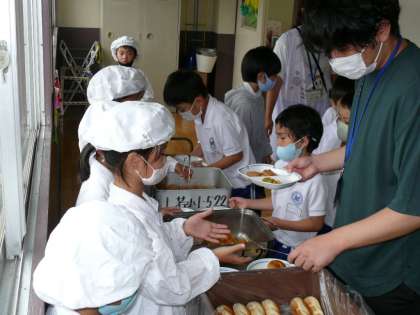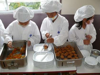 給食の配膳にもすっかり慣れ、自分たちでしっかりできるようになりました。