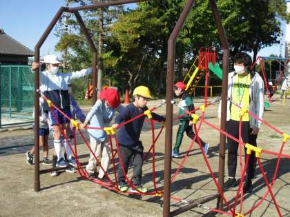 4年生とフレンドのみんなが遊具の使い方を学び、練習していました。解禁日は近い!