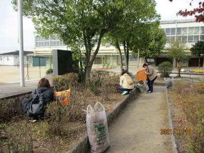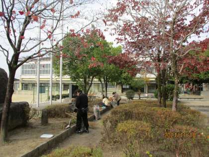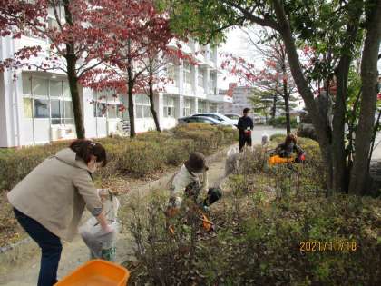 環境サポーターさんたちが校舎前の植え込みをきれいにしてくださいました。