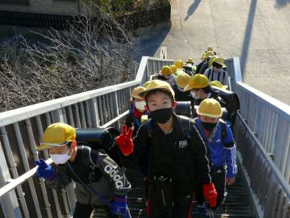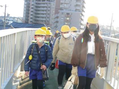学校再開2日目です。今日もお兄ちゃん、お姉ちゃんが通学団の安全を守ってくれています。いつもありがとうね。寒い朝ですが、にっこり笑って「ピース!!」。今日も元気に登校できました。