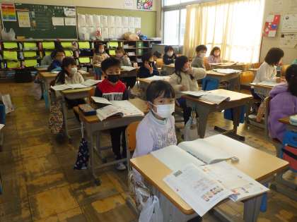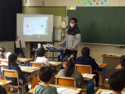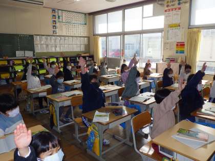 授業の様子です。1年2組は、みんながまっすぐ手をあげています。担任の澤田先生もとっても嬉しそうです。