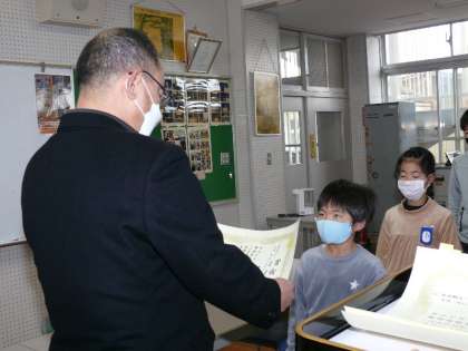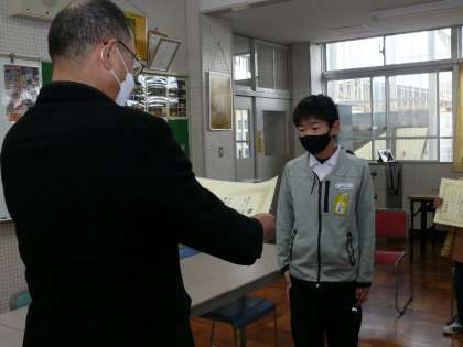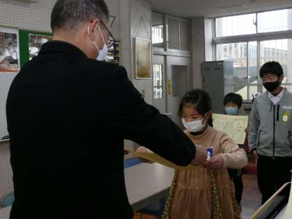 集会の最後に、表彰を行いました。今日の表彰は「ふるさとの田んぼと水 子ども絵画展2021」です。優秀な成果を残すことができました。賞を受賞したみなさん、心よりおめでとうございます。