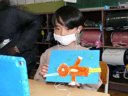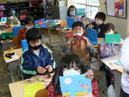 続いては2年生の図工の授業の様子です。色画用紙を使って、素敵な作品を作ることができました。お気に入りの作品を手に、にっこり笑っていい表情です。