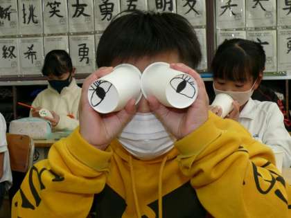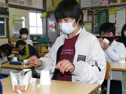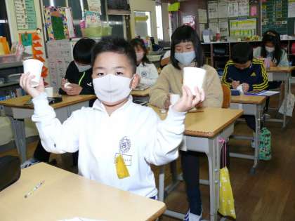 4年生の音楽の授業です。手作りの楽器を使って演奏です。大きな目の子もいて、びっくり!!です。楽しい授業の様子が写真の表情からも伝わってきます。
