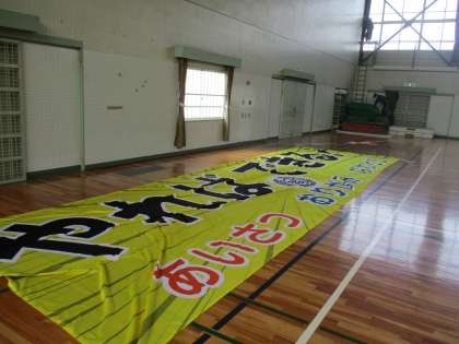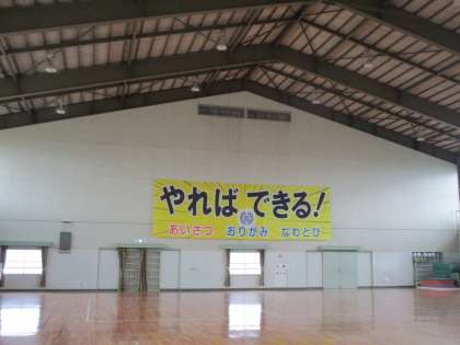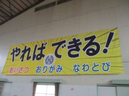 体育館に大きな大きな「やればできる」横断幕が設置されました。