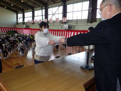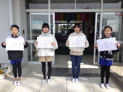 感謝の会終了後、表彰を行いました。『人権を理解する作品コンクール』において、優秀な成果を収めた4名の児童が表彰されました。おめでとうございます。表彰後、4名の児童は玄関前で記念撮影。晴れやかな表情がとても素敵ですね。