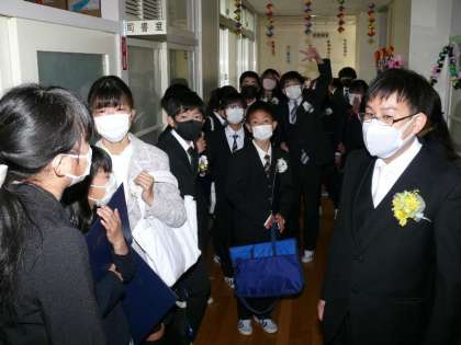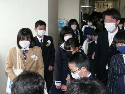 卒業式、学級でのお別れの後、校舎内で門送を行いました。お世話になった6年生の門出を在校生、教員で祝いました。通学班や委員会、行事など、さまざまな場面で下級生を引っ張ってくれた卒業生。今まで本当にありがとうね。中学校でもがんばってね。
