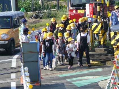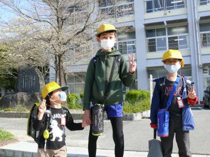 今日は令和4年度はじめてシリーズです。まずははじめての1年から6年までの全校児童の朝の登校です。6年生のおにいちゃん、おねえちゃんが優しく学校まで連れてきてくれました。