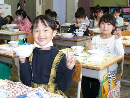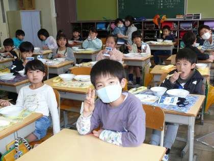 続いてははじめての給食です。今日はほねぶとサラダ、ぶたにくのしょうがいためでした。とってもおいしかったですね。