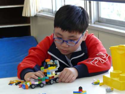 フレンド学級の朝の様子です。今日も元気に登校できました。ブロックを組み合わせてできたのは車かな?