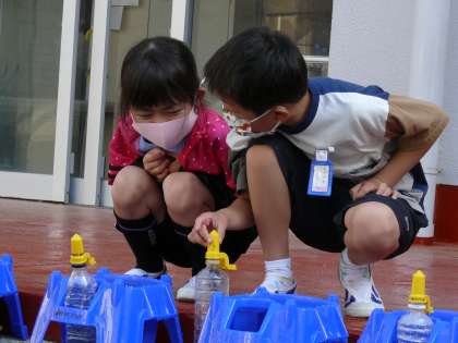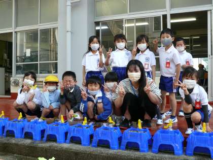 1年生は朝、アサガオに水やりをしています。早く芽が出てほしいですね。元気に育つように、お世話を一生懸命頑張りましょうね。