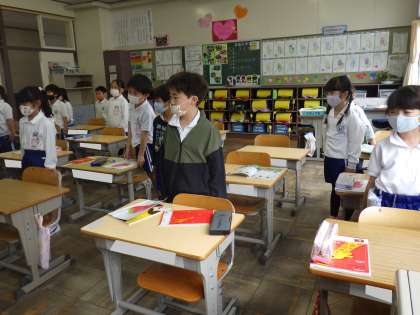 続いて1年4組,1年5組です。気をつけの姿勢がしっかりとできてかっこいいですね。