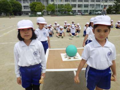 3年生の競遊種目「ボール運びリレー」の練習の様子です。みんなでバランスをとって、ボールを落とさないように気を付けて走っています。