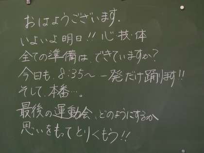 担任の先生から6年生への黒板メッセージです。明日の運動会は若小での最後の運動会ですね。練習の成果を出し切ってくださいね。