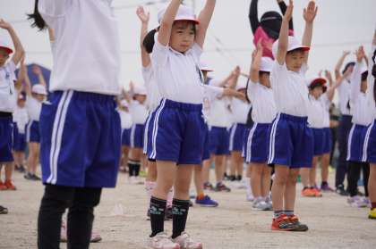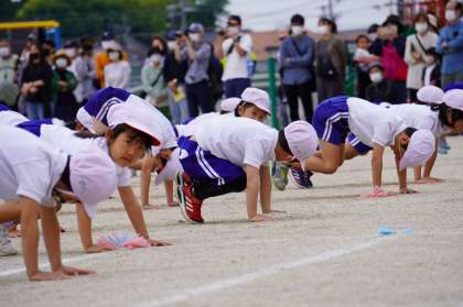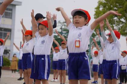 続いては、1,2年生の増筋力体操の様子です。リズムに合わせて上手に準備運動ができました。