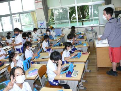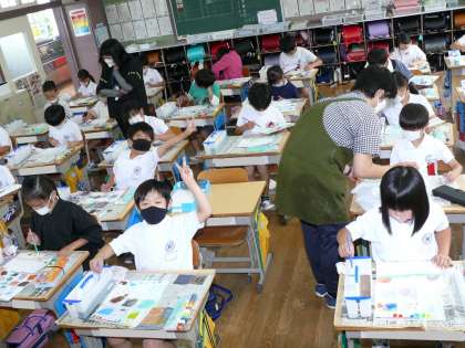 3年1組,2組の授業の様子です。学習用タブレットを用いた学習と、図工の授業の様子の1コマです。