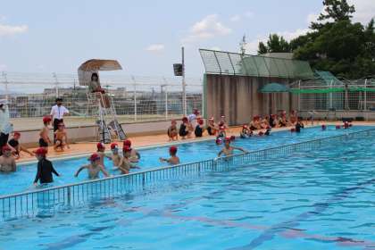 3年3組,3年4組のプールの授業の様子です。カニさん歩きに挑戦中です。