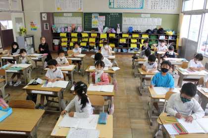 つづいて1年4組,1年5組の授業の様子です。1年5組は学習用タブレットを使ってアサガオの撮影をしました。アサガオが大きく育ってきましたね。