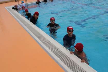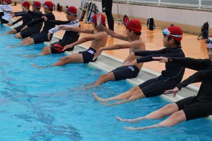 6年1組,6年2組のプールの様子の続きです。バタ足の時の足の動かし方を確認するために、手を足に見立てて練習中。手を使うことで、正しい足の動かし方を理解することができましたね。