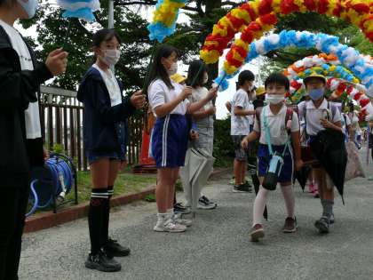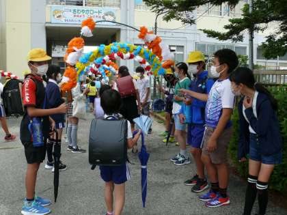 今日も6年生のあいさつ係さんによるあいさつ運動が行われました。あいさつ係さんによるアーチをくぐって1日が始まります。