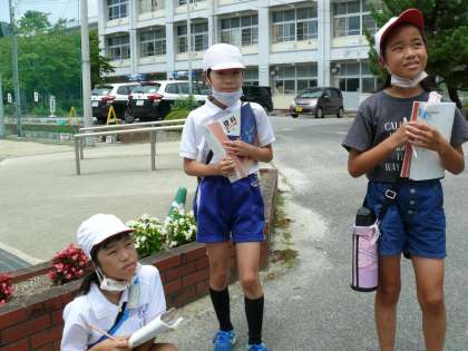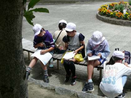 4年3組は理科の授業で夏の植物の観察中。とっても暑い中でしたが、目をキラキラとさせて植物の観察をしていました。
