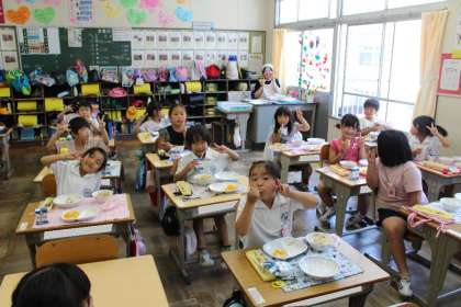 昨日の給食の様子をお届けします。まずは1年4組,1年5組,2年1組の様子です。