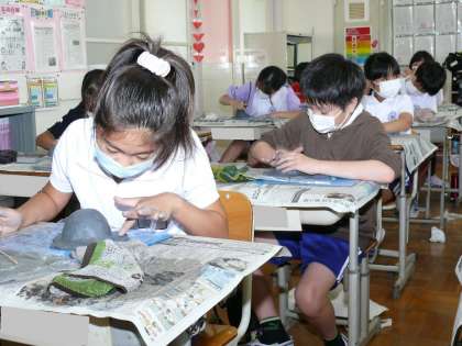 6年1組は兜づくりに挑戦しました。講師として正木様にご来校いただき、兜の作り方を丁寧に教えていただきました。子どもたちは集中して黙々と作業に取り組み、本物のように立派な兜を完成させることができました。