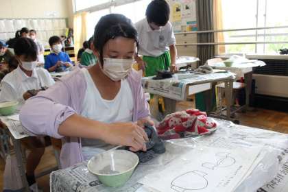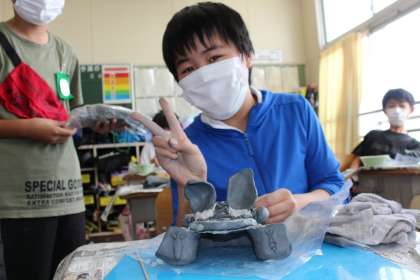 6年3組の兜づくりの様子の続きです。自慢の作品と一緒にピース!!