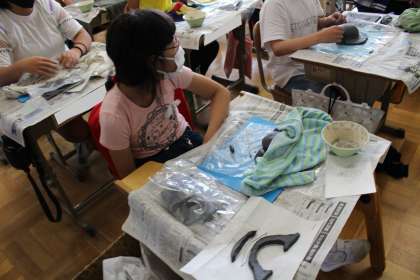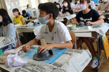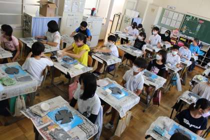 今日は6年4組が兜づくりに挑戦です。講師の方のお話をしっかりと聞いて、オリジナルの兜づくりに取り組みました。