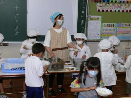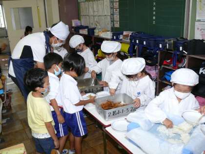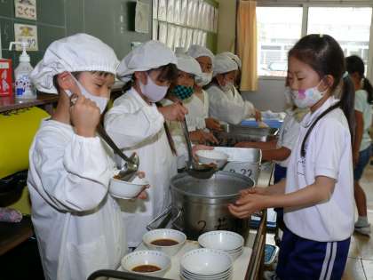1年1組,1年2組,1年3組の給食の準備の様子です。先生もエプロンをして子どもたちと一緒に配膳です。