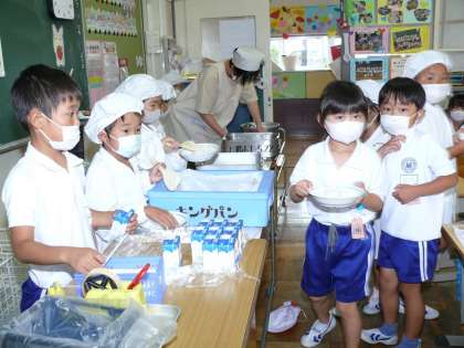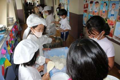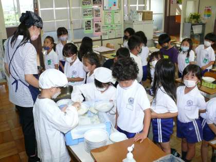 1年4組,1年5組,2年2組の給食の準備の様子です。2年生は子どもたちだけで上手に配膳ができていますね。