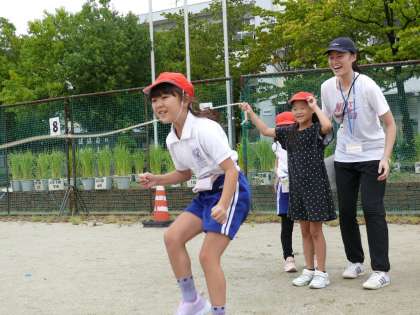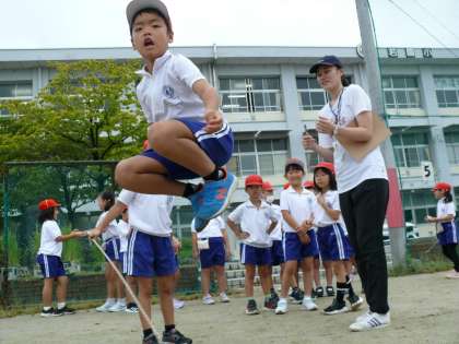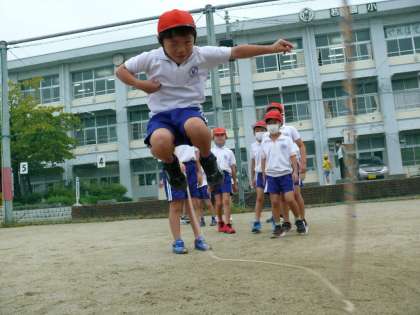 2年2組の体育の様子です。八の字跳びに挑戦中。上手に跳ぶことができたかな?