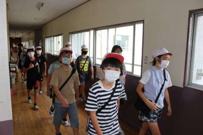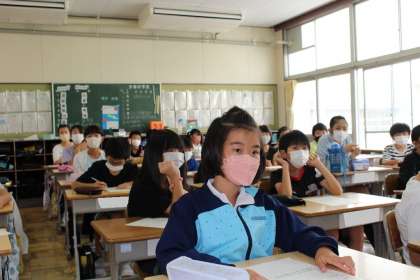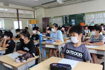 5年3組の図工の様子です。木のイメージについて発表した後、木のスケッチに校庭に出かけました。