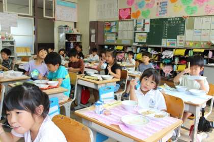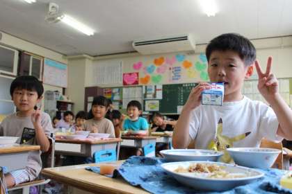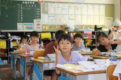 続いて1年5組の給食の様子です。カメラに向かってピースサインがすてきですね。