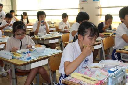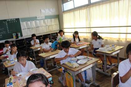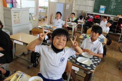 4年3組の給食の様子です。カメラに向かってニッコリ、ピースサイン!!