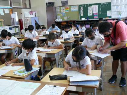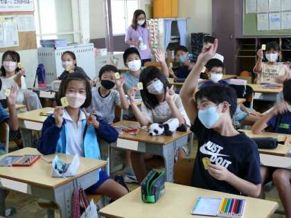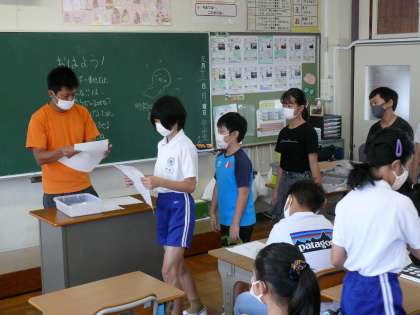 5年1組,5年2組,5年3組の朝の様子です。暑い朝でも若小の子どもたちは元気です。