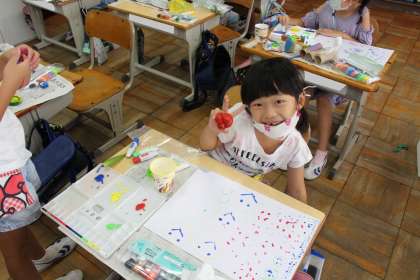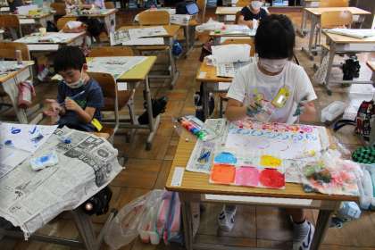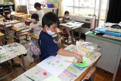 1年1組の図工の授業様子です。玉ねぎやピーマン、ペットボトルキャップなどをスタンプにして絵を描いていました。