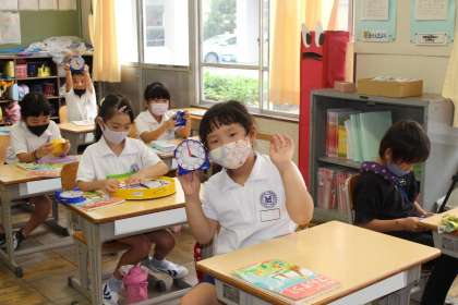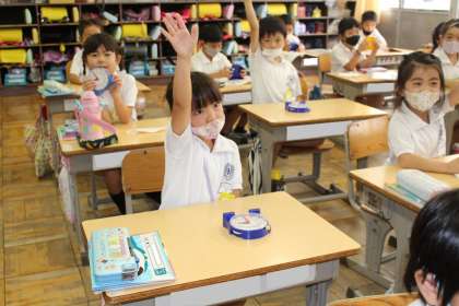 1年2組の算数の授業です。時計の学習中。正しく時間をよめたかな?