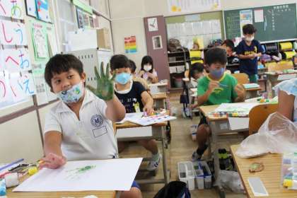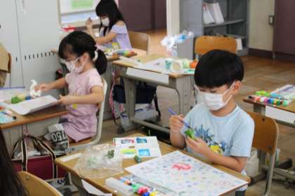 1年4組の図工の授業の様子です。野菜を使ってスタンプ画に挑戦中。楽しく活動できました!!