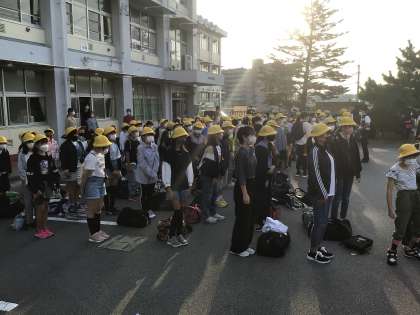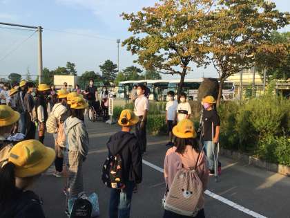 教頭先生と保護者の皆様に「行ってきま〜す」。保護者の皆様、早朝からありがとうございました。
