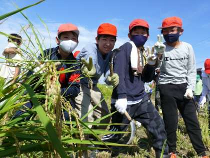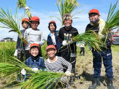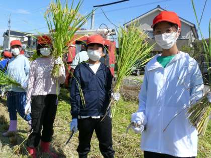 5年2組,5年4組の稲刈りの様子です。刈り取った稲を手に「ハイ、チーズ!!」みんなとってもいい表情ですね。